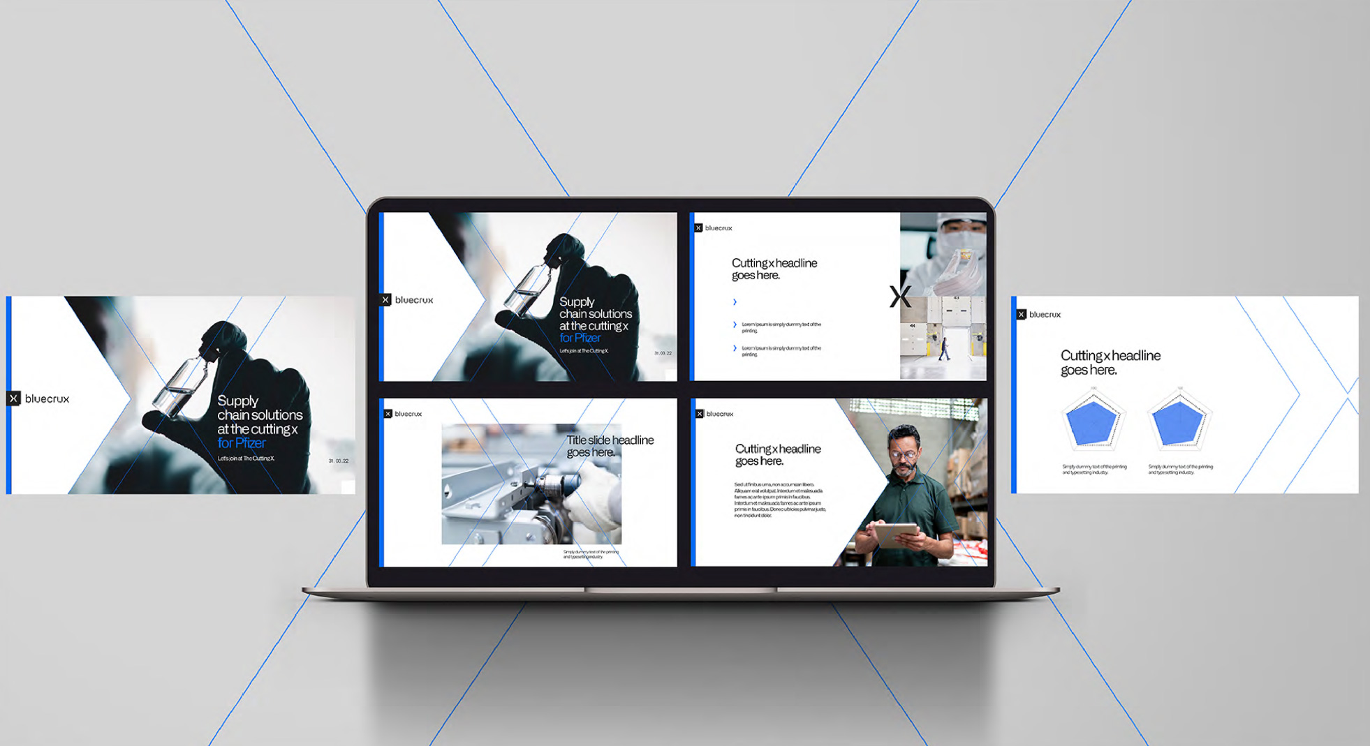 Combining the striking Cutting X visual with up-close and personal photography, these images illustrate Bluecrux’s laser focus and help convey the intersection of technology and expertise the consultancy offers.