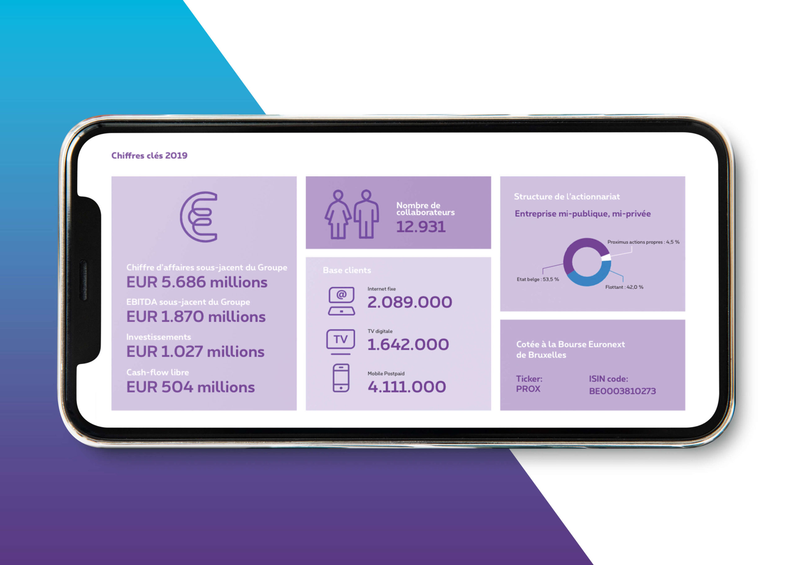 - We started designing the annual report whilst copywriting was in progress. There was a direct line between Proximus and our graphic designer too. The company recently established a new look and feel, so we happily took the challenge of integrating this in the report.